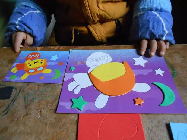 EVA贴画的色彩丰富,可以强化幼儿对颜色的认知;贴画需要将材料碎片拼合成整体形象,在此过程中提升了小朋友的审图的能力的训练。更重要的是,贴画的制作过程也是孩子专注力和耐心养成的过程。